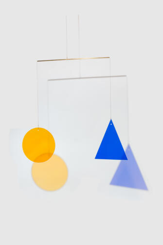 Always in motion, the coloured glasses of the mobiles cast alternating points of light into the room. Depending on the angle of view and the incidence of light, the glasses appear from intensely coloured, subtly shimmering, to shiny or transparent. The mood they emanate reflects space and time, as it is created by the interplay of environment and light and the perception of the observer.